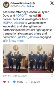 “Ndihmës Prokurori i Përgjithshëm A. Tysen Duva dhe #OPDAT pritën prokurorë dhe hetues nga @SPAK_Albania për të mirëpritur lidershipin e ri dhe për të forcuar partneritetin tonë në luftën kritike kundër krimit të organizuar dhe korrupsionit transnacional. @SPAK_Albania i angazhuar me @Departamenti i Drejtësisë #ICITAP , @FBI, dhe @DEAHQ Faleminderit @StateINL për mbështetjen!“, thuhet në reagim.