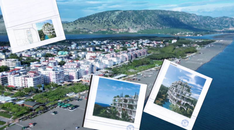 Në foto: Projekti i godinës 7 katëshe në mes të rërës dhe pishave në Velipojë